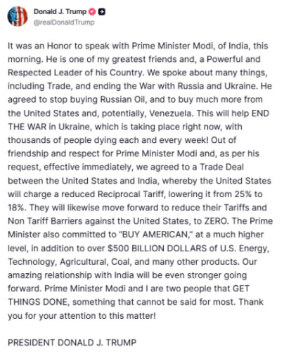 Для мене було честю поспілкуватися сьогодні зранку з прем'єр-міністром Індії Моді. Він один з моїх кращих товаришів та впливовий і авторитетний лідер своєї країни. Ми обговорили безліч питань, у тому числі торгівлю та зупинку війни між Росією та Україною. Він дав згоду перестати купувати російську нафту та купувати набагато більше нафти у США та, можливо, у Венесуели. Це допоможе зупинити війну в Україні, яка відбувається просто зараз і в якій щотижня гинуть тисячі людей.