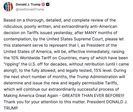 Прошу розглядати цю заяву підтвердженням того, що я, як лідер Сполучених Штатів Америки, негайно збільшую 10-відсотковий універсальний збір для всіх держав — багато з яких десятиліттями "оббирали" США без будь-якої відповіді (до тих пір, поки не з’явився я!) — до максимально допустимого та юридично підтвердженого рівня у 15%.