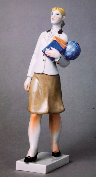 Незважаючи на раціональну наукову тематику, статуетки випромінюють сердечність. В образах втілено оптимізм розуму, довіру до освіченої людини, у світ, який змінюється на краще завдяки знанням. Ось порцелянова статуетка «Вчителька» авторства Оксани Жникруп, створена на Київському експериментальному кераміко-художньому заводі (КЕКХЗ) у 1969 році. Висота статуетки — 29,6 сантиметра.