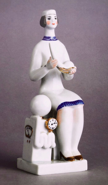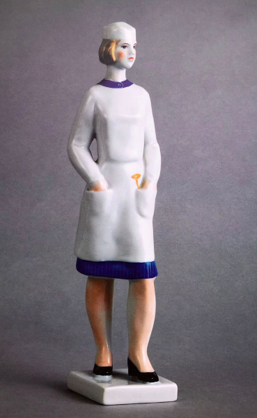 — Лікар та хімік з колбою в руках. Висота останньої фігурки — 21,2 сантиметра. У цьому образі мисткиня втілила дух раціоналізму, точності та спокійної переконаності. Поза героїні витримана, проте пластика рук і нахил голови свідчать про концентрацію і внутрішнє напруження, знайоме кожному, хто має справу з дослідами. Композиція виконана у стислому, майже архітектурному стилі: геометричні форми лабораторного обладнання, плавні лінії халата, статична посадка. Білий колір порцеляни уособлює чистоту і стерильність наукового середовища, а деталі в кобальтовому і золотому кольорах — вимірювальні прилади, рукавички, комір — додають ритму і декоративного звучання.