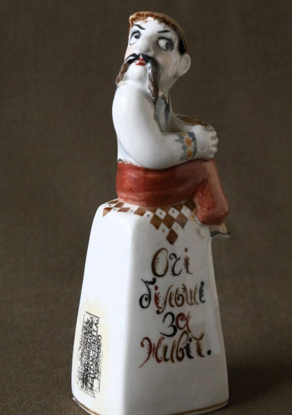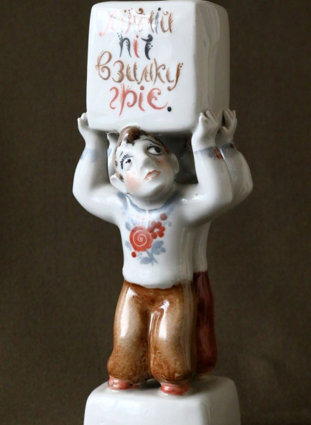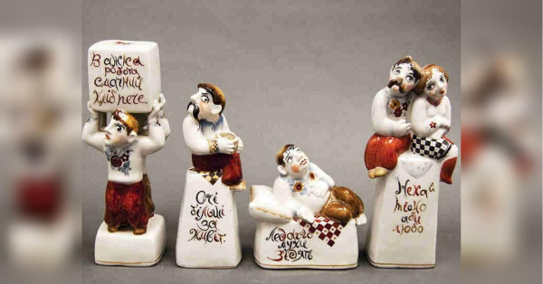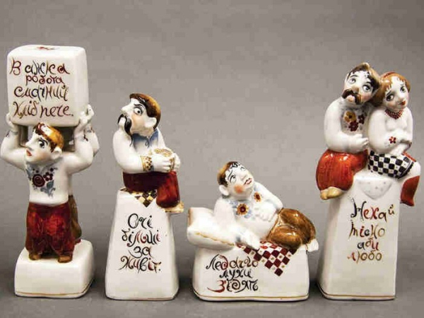 — Ця серія творів, натхненна українськими прислів’ями та приказками, є рідкісною, — ділиться Людмила Карпінська-Романюк. — Вона була створена сімейною парою Валерієм Албулом і Наталією Албул. Написи на постаментах можна розібрати лише в русі — обходячи фігурки поглядом довкола. Текст тут є частиною композиції та мотивує глядачів замислитися над важливими життєвими аспектами. Фронтальна сторона кожної роботи — жест і вираз обличчя, тильна — висновок. Між ними — перерва для особистого міркування. Персонажі надзвичайно колоритні. Серія скульптур була створена на Городницькому фарфоровому заводі у 1983 році.