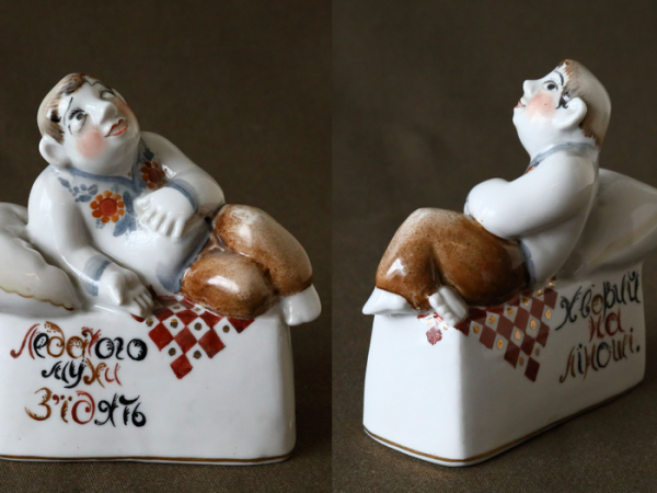 В. Албул у розпису Н. Албул. Скульптурна серія робіт на теми українських прислів’їв та приказок. Городницький фарфоровий завод. 1983 рік