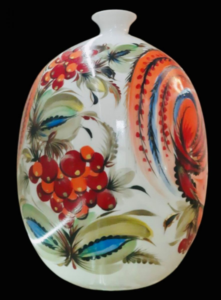 Круговий живопис вражає! Коли обійти вазу і подивитися збоку, композиція розкривається по-новому. На її округлих поверхнях з’являються густі китиці калини. Їхнє тепле сяйво врівноважує полум’яну хвилю півнячого пір’я, створюючи відчуття ритму і обертального руху, начебто вся природа зібралася в спільному танці кольорів. Великі декоративні квіти, розкриті на повну потужність, палають помаранчевими і червоними відтінками, а золото на пелюстках додає урочистої шляхетності. Баранівська порцеляна завжди вміла спілкуватися з глядачем через деталь, і ця ваза саме така.