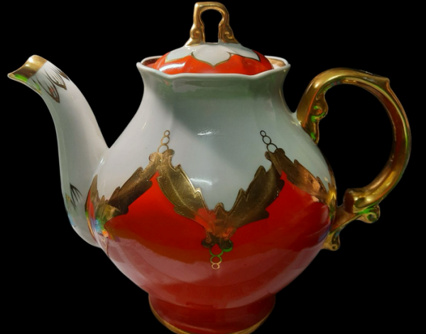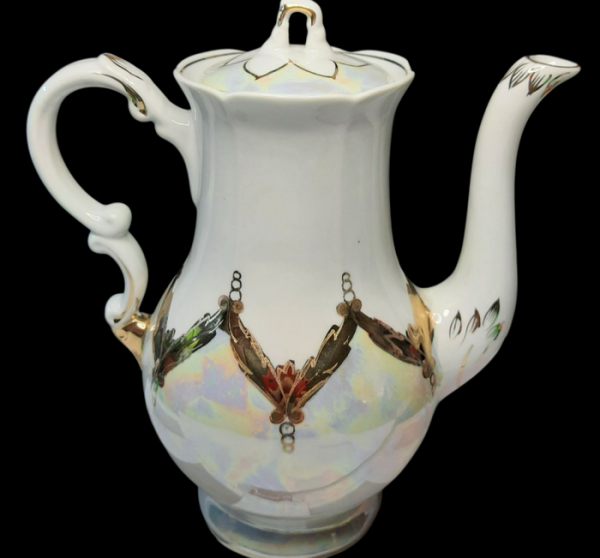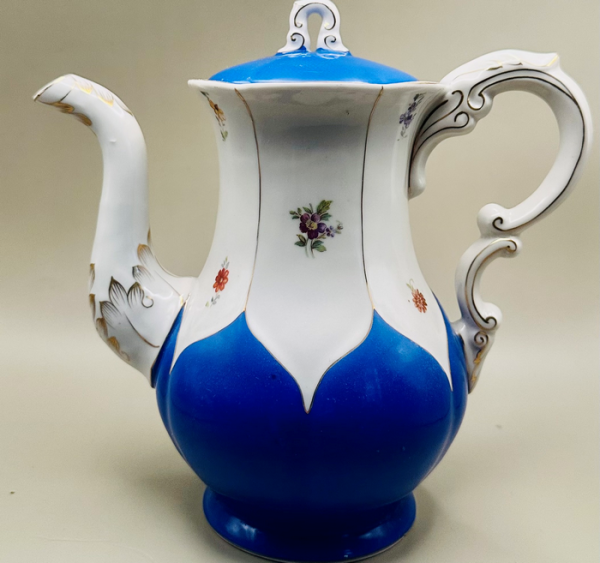 — З квітами. Його я одного разу отримала як презент. Насичений синій колір, як серпневе нічне небо. На цьому фоні маленькі квітки, намальовані майстерною рукою, викликають спогади про затишок українських садів, про насолоду, яку люди намагалися відновити після важких років війни. Золото на боках — світло стримане, ніжне, як вранішній промінь на білій стіні. Це об’єкт, який не тільки зберігає тепло напою — він зберігає тепло рук, що творили красу всупереч умовам. Дивлячись на нього, можна відчути повоєнний 1946 рік, коли фарфор був не просто ужитковим предметом, а надією.