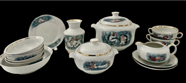 Сьогодні йтиметься про порцеляновий гарнітур «Лісова пісня», котрий був виготовлений на Тернопільському фарфоровому підприємстві. Він складається з чайного та обіднього комплектів, тарелі, а також ансамблю ємностей для сипких продуктів.
