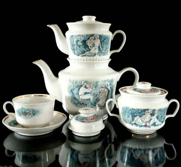 В. Спиця, В. Горолюк, О. Томків-Войтович. Чайний сервіз форми «Ромашка». Малюнок «Лісова пісня». Тернопільський фарфоровий завод. 1991