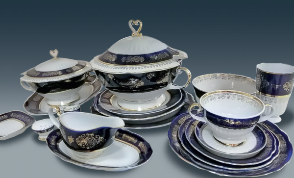 — А ось ще один чудовий столово-чайно-кавовий сервіз «Перлинний» (на фото в заголовку. — Авт.). Він належить до найвишуканіших зразків української порцеляни кінця ХХ століття. У цьому витворі поєдналися пластична культура форми, декоративна стриманість і відчуття внутрішньої урочистості. Форма сервізу м’яка, округла, з плавними переходами, що створюють відчуття гармонії й завершеності. Хвилясті краї чашок і мисок нагадують раковини, підсилюючи асоціативний образ назви. Витончені носики, елегантні ручки, підняті на ніжках чашки надають композиції святкового, майже церемоніального звучання. Декор побудований на глибокому темно-кобальтовому тлі, яке, мов нічне море, відкриває простір для золотого орнаменту. Рослинні мотиви виконані у техніці надглазурного розпису з використанням золота. Золото тут не домінує, а звучить, як світловий акцент, подібний до мерехтіння перлин у глибині води. Кожна деталь підпорядкована єдиній ідеї — створити атмосферу урочистої тиші.