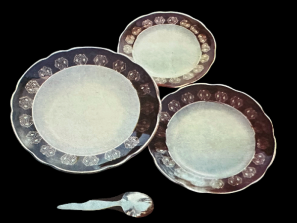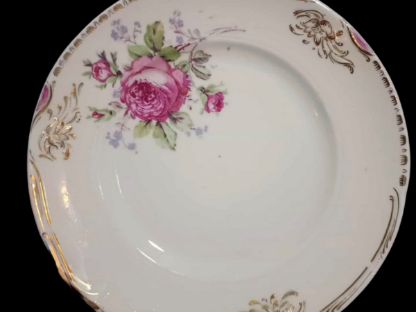 Головний мотив — пишна пурпурова троянда з бутонами й легкими бузковими тінями — виписаний у характерній для 1950-х м’якій живописній манері. Золота стилізована графіка по краю — ручна, тонка, підкреслює вишуканість форми й надає виробу святкової завершеності. Такі тарілки були популярними у святкових сервізах і вважалися ознакою смаку та добробуту українських родин 1950-х років.