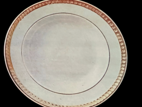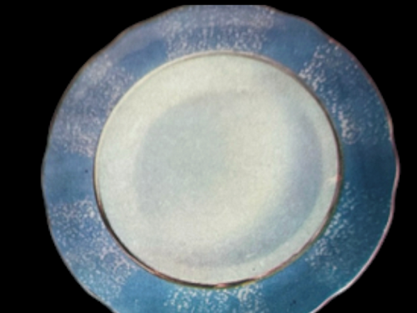– А от тарілки з широкою блакитною смугою, декорованою напиленням і тонкою золотою лінією. Цей тип орнаменту створював ефект глибини, ніби колір розчиняється у блиску глазурі.
