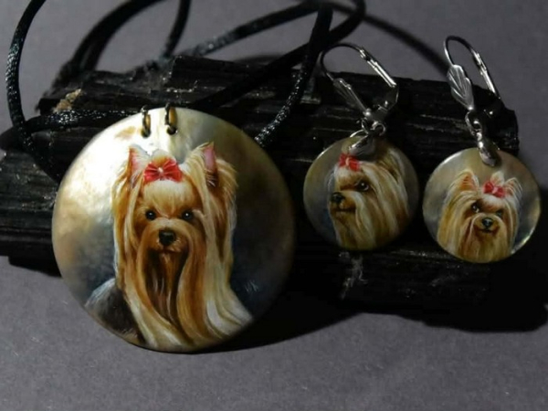 – Ось йорки — вони зовсім малесенькі, але ж які харизматичні! Відразу зрозуміло, що в їхніх маленьких тілах живуть сміливі душі. Цей комплект прикрас написаний на пластинах справжнього перламутру. Він має ніжний м’який блиск.