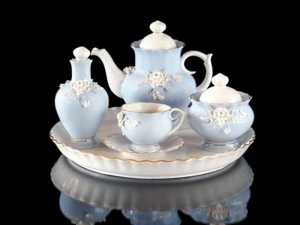 – А ось чайний сервіз Ніни Василенко – він наче зосереджене мовчання між реченнями, коли тиша говорить більше, аніж звук, – продовжує Людмила Карпінська-Романюк. – Блакитний колір порцеляни нагадує вранішнє небо – ще прохолодне, незаймане, не схвильоване денним рухом. У ньому є відчуття спокою та внутрішньої зосередженості, притаманне речам, виготовленим не для демонстрації, а для тривалого співіснування з людиною. Форми округлі та гармонійні. Чайник – наче серцевина композиції: плавний, злегка присадкуватий, з лагідним вигином носика та ручки, що ніби відтворюють рух руки. Цукорниця та молочник підтримують цей ритм – вони не змагаються між собою, а тихо співіснують, створюючи затишний ансамбль. Чашка – особливо тепла на дотик: її об’єм начебто зроблений саме для долонь, для неквапливого чаювання. Ліпний квітковий декор тут – це не розкішний букет і не парадна флористика, а лаконічна, майже інтимна квітка, котра розпускається на білому тлі як символ турботи. Золота смужка по краю – легка, ненав’язлива – утримує композицію, додає їй завершеності, але не перетягує увагу. Усе в цьому сервізі збудовано на балансі: між формою та декором, між білизною та кольором, між ужитковістю та мистецтвом. Цей чайний сервіз – яскраве підтвердження того, як Дружківський фарфоровий завод у 1980-х роках знаходив власний почерк. Не гучний, не суперницький, а впевнений і впізнаваний. Саме завдяки таким виробам завод заявив про себе як про художню школу – з витонченим відчуттям матеріалу, смаком до форми та вмінням спілкуватися з глядачем мовою тиші.