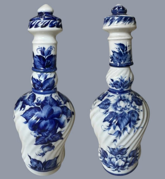 — На вишуканій формі графинів для лікеру, виконаній Миколою Трегубовим, художниця Наталія Галушко-Аксьоненко розгорнула цілу галерею кобальтових квітів — пишних півоній і руж, що розквітають на білому фарфорі.