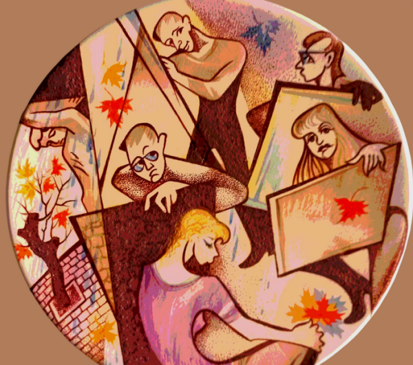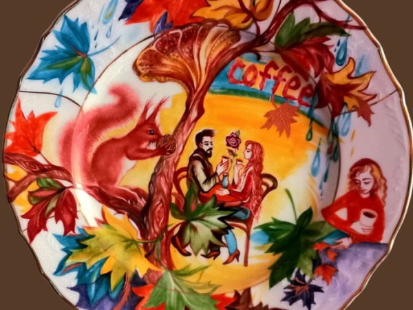 Художниця перетворює повсякденну сцену на справжню мальовничу оповідь, де осінь – не просто пора року, а емоційний стан, душевний стан. У центрі композиції – молода пара за кавою, заглиблена у теплу розмову. Фігури закоханих сповнені відвертості. Дивовижне дерево з химерною кроною у формі гриба, наче парасолька, захищає закоханих від дощових крапель, що падають згори. На гілці білочка – символ осені, затишку та щастя, яке ховається у простих речах. Осіннє листя летить у ритмі осіннього вітру. Їхнє різнобарв’я підкреслює теплоту почуттів. У кафе бачимо ще одну самотню постать, це замріяна дівчина з чашкою. Осінь налаштовує на роздуми. Ця таріль – маленький театр осені, де кожен герой – листок, білочка, пара закоханих, дівчина, крапля – має свій голос. Це ніжна та водночас яскрава візуальна розповідь про людське тепло, осінні кольори та просте щастя – чашку кави з близькою людиною.