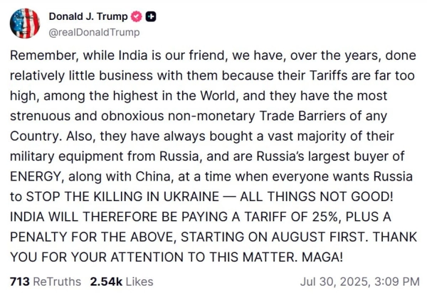 Хоча Індія наш друг, у нас роками був відносно невеликий бізнес з ними, оскільки їх мита занадто високі. Також вони завжди закуповували більшість військового обладнання в Росії, а ще вони найбільший закупівельник енергоносії у росії разом з Китаєм в той час, коли всі хочуть, щоб росія припинила вбивства в Україні – все це не добре. Тепер Індія буде сплачувати 25% мита, плюс додатковий штраф з 1 серпня