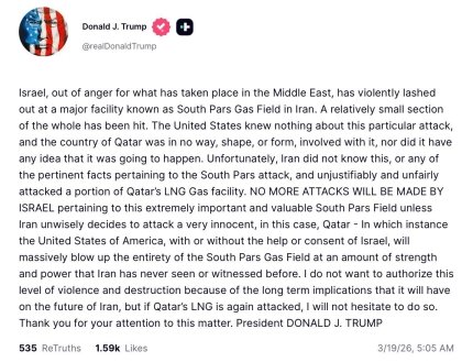 Він додав, що якщо напад на Катар знову трапиться, тоді США "за допомогою або без сприяння Ізраїлю — знищать усе газове родовище "Південний Парс"". За словами Трампа, це знищення буде "з такою потужністю і силою, яких Іран раніше не бачив".