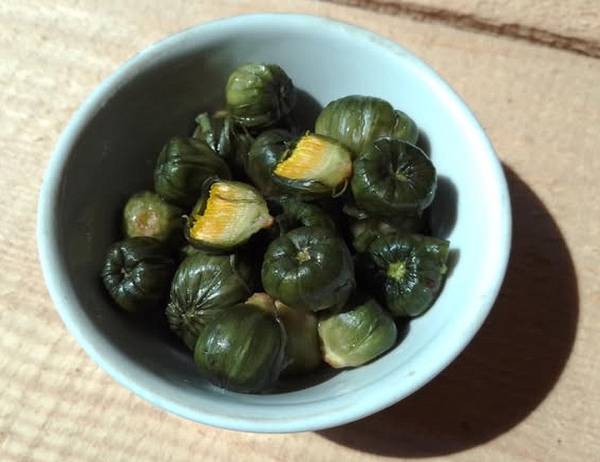 Також готує Олена і кульбабові каперси – “це, несподівано, дуже смачно й хрумко. Склянка бутонів молодої кульбаби, ложка солі, вода. Залишити на тиждень в банці. Збирати на етапі, коли бутони тільки з’явились у розетці, а стебло іще не виросло”