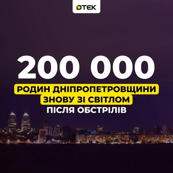 У Дніпропетровській області після ворожих ударів з боку рф відновили електропостачання 200 тисячам сімей. Біля 600 тисяч сімей регіону досі перебувають без електрики.