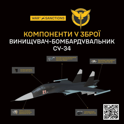 ГУР МО України у підрозділі “Компоненти в озброєнні” ресурсу War&Sanctions представляє інтерактивну 3D-модель і дані про виробників ключових систем і деталей ударного бомбардувальника Су-34.