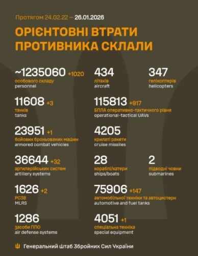 Сукупні бойові втрати російських військ у період з 24 лютого 2022 року по 26 січня 2026 року під час війни проти України складають приблизно 1 235 060 осіб, зокрема 1 020 осіб – за останню добу.