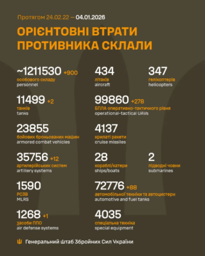 Сукупні бойові втрати супротивника з 24.02.22 по 04.01.26 приблизно становлять:
