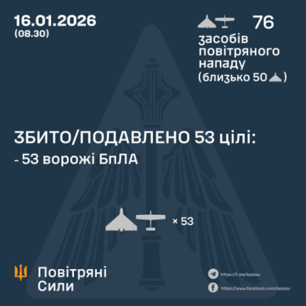 За попередніми відомостями, за станом на 08:30, протиповітряна оборона збила/придушила 53 ворожі БпЛА.