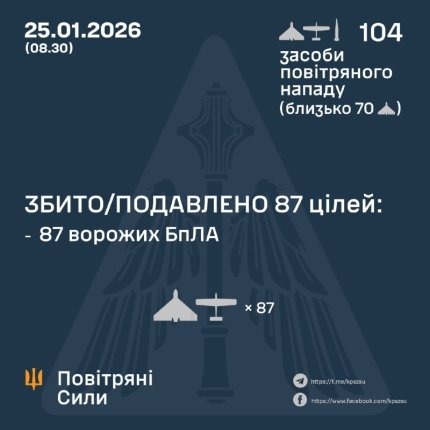 Вночі з 24 на 25 січня російські окупанти здійснили повітряний удар по українських містах і селах двома балістичними ракетами Іскандер-М/зенітними керованими ракетами С-300, а також 102 ударними БпЛА типу Shahed, Geran і безпілотними літальними апаратами інших моделей. Сили протиповітряної оборони нейтралізували 87 ворожих об’єктів.