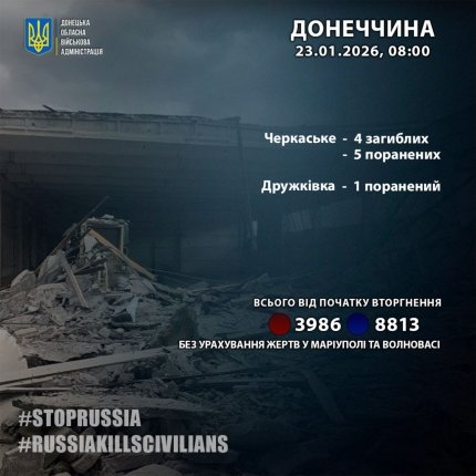 За 22 січня росіяни вбили 4 мешканців Донеччини: у Черкаському. Ще 6 осіб в області за минулу добу отримали поранення.
