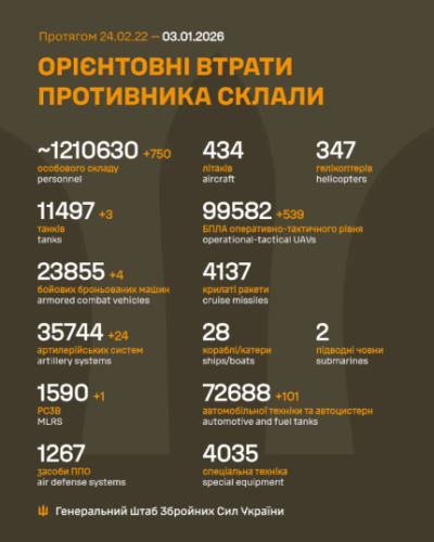 Загальні бойові втрати супротивника з 24.02.22 по 03.01.26 орієнтовно склали: