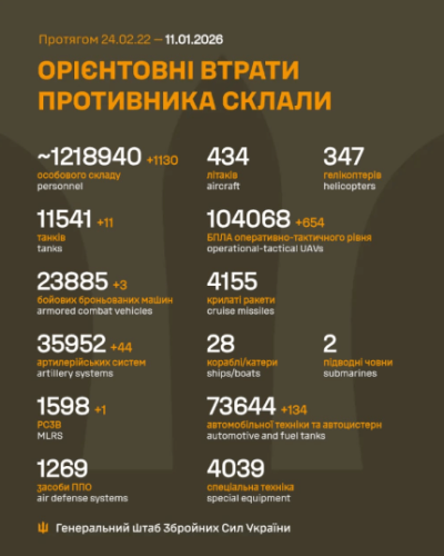 Сукупні бойові втрати супротивника з 24.02.22 по 11.01.26 орієнтовно становлять: